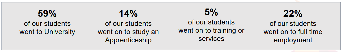 We are incredibly proud that our Post 16 students go on to a wide range of destinations. Our students are supported with making the choice that is right for them.